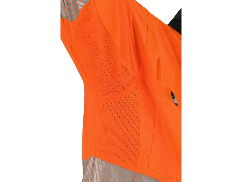 Męska kurtka ostrzegawcza, ramiona wzmocnione materiałem CORDURA, rękawy z regulowanym mankietem na rzep, przykryte zapinanie na zamek, rzepy i zatrzaski, lewa kieszeń na piersi zapinana na zamek, prawa kieszeń z klapką, kieszeń na ołówki na lewym rę