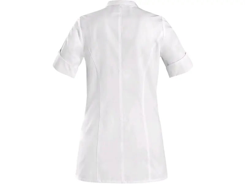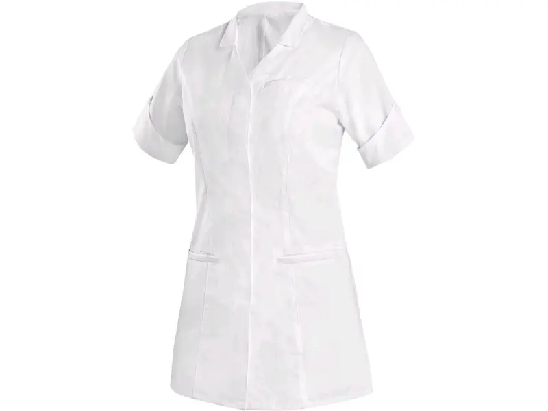 Damska bluza z krótkim rękawem, fason dopasowany do figury, ukryte zapięcie na guziki, 3 przednie kieszenie ozdobione satynowym wykończeniem. Zalecane zastosowanie: wellness, salony kosmetyczne, prywatne gabinety lekarskie, kliniki i duże placówki medyczne, pogotowie ratunkowe, uzdrowiska i kąpiele, instytucje opieki społecznej, apteki, szkoły o profilu medycznym i gastronomicznym.