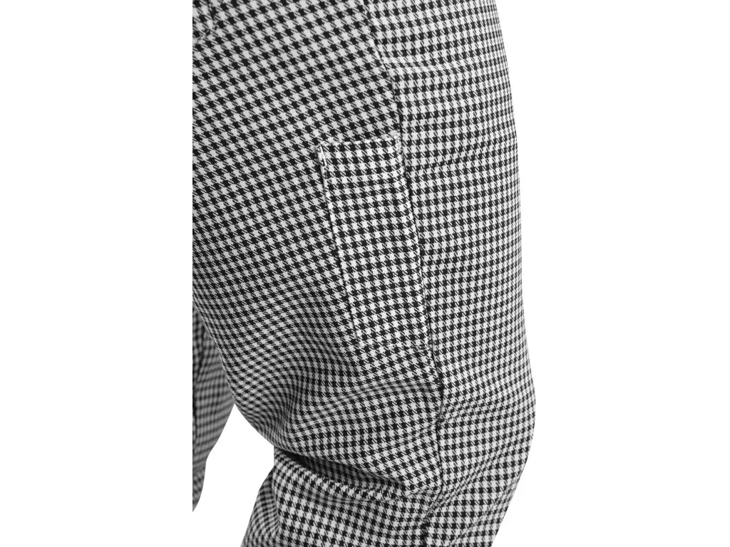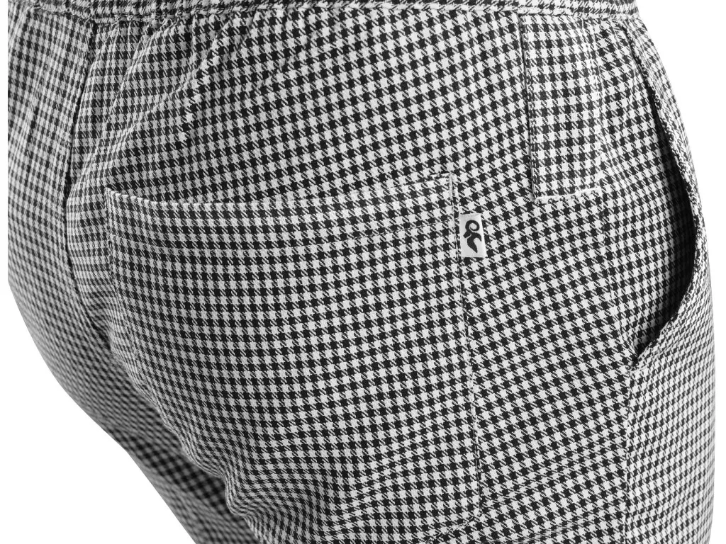 Męskie spodnie kucharskie w popularny wzór pepitki łączą wygodę z funkcjonalnymi detalami przeznaczonymi do codziennej pracy w gastronomii. Elastyczny pas z gumą oraz sznurkiem do regulacji umożliwia łatwe dopasowanie do sylwetki i zapewnia komfort nawet podczas długiego dnia pracy. Przednie kieszenie skośne oraz tylna naszywana kieszeń służą do przechowywania drobnych przedmiotów. Na prawym udzie znajduje się praktyczna kieszeń na pęsetę kucharską lub długopis, dzięki czemu najważniejsze narzędzia są zawsze pod ręką. Z tyłu, poniżej pasa, znajduje się również uchwyt na ściereczkę, który zwiększa wygodę pracy w kuchni. Spodnie są wyposażone w system EASY-PROLONG, który umożliwia łatwe przedłużenie spodni do wyższej sylwetki poprzez rozprucie kontrastowego szwu na nogawkach. Zalecane zastosowanie: kuchnie hotelowe, stołówki zakładowe i szkolne, bistra, szkoły gastronomiczne, zakłady mięsne.