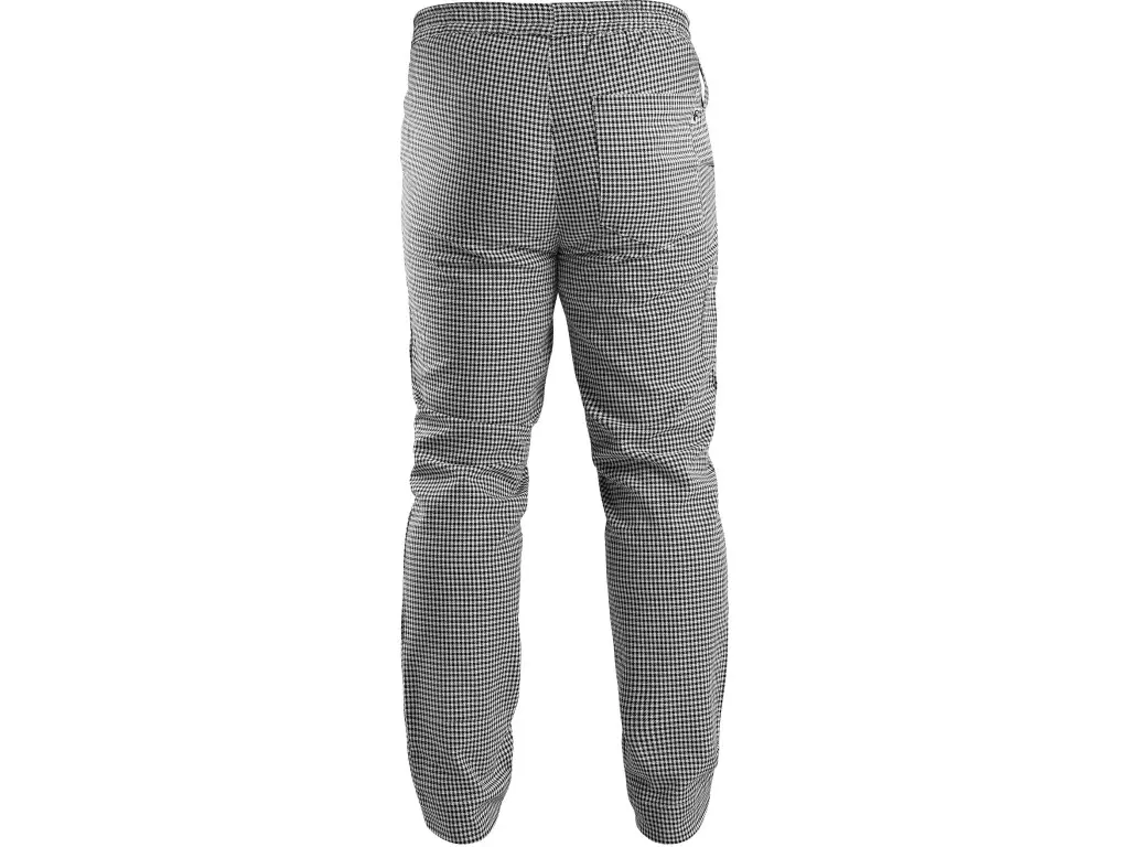 Męskie spodnie kucharskie w popularny wzór pepitki łączą wygodę z funkcjonalnymi detalami przeznaczonymi do codziennej pracy w gastronomii. Elastyczny pas z gumą oraz sznurkiem do regulacji umożliwia łatwe dopasowanie do sylwetki i zapewnia komfort nawet podczas długiego dnia pracy. Przednie kieszenie skośne oraz tylna naszywana kieszeń służą do przechowywania drobnych przedmiotów. Na prawym udzie znajduje się praktyczna kieszeń na pęsetę kucharską lub długopis, dzięki czemu najważniejsze narzędzia są zawsze pod ręką. Z tyłu, poniżej pasa, znajduje się również uchwyt na ściereczkę, który zwiększa wygodę pracy w kuchni. Spodnie są wyposażone w system EASY-PROLONG, który umożliwia łatwe przedłużenie spodni do wyższej sylwetki poprzez rozprucie kontrastowego szwu na nogawkach. Zalecane zastosowanie: kuchnie hotelowe, stołówki zakładowe i szkolne, bistra, szkoły gastronomiczne, zakłady mięsne.