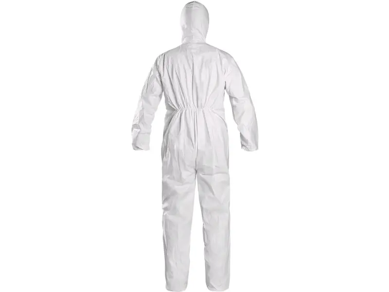 Jednorazowy kombinezon ochronny z kapturem. Kaptur, mankiety i spodnie zakończone gumką. Elastyczny pas. Kryty zamek z klapką. Zalecane zastosowanie: malarze, rolnictwo, farmacja i placówki medyczne.