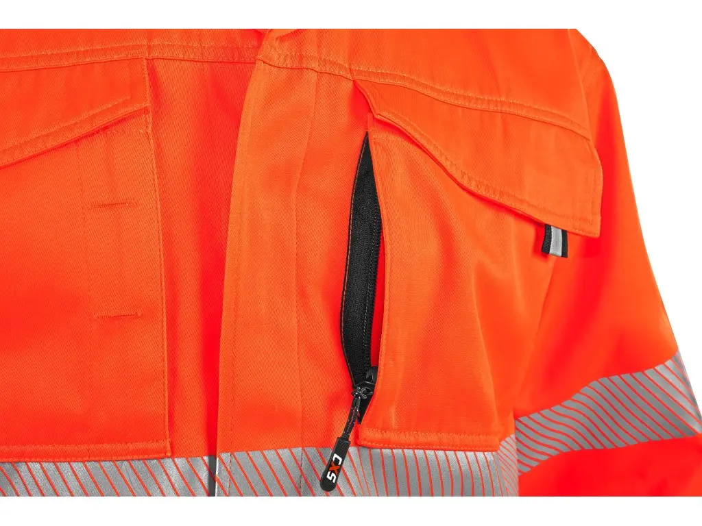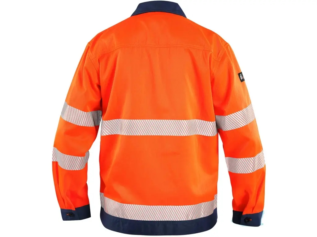 Męska bluza ostrzegawcza z segmentowymi taśmami odblaskowymi (o szerokości 5 cm). Splot diagonal zapewnia trwałość i odporność materiału. Bluza posiada zakryte zapięcie na plastikowe guziki, kieszenie na piersi z patkami na rzep – lewa z ukrytą kieszenią na zamek, prawa z małą kieszonką na długopis. Dodatkowo wyposażona jest w kieszenie boczne oraz mankiety zapinane na plastikowy guzik. Zalecane zastosowanie: budownictwo, prace drogowe, kierowcy, utrzymanie, logistyka, transport lotniczy i morski, odśnieżanie, ratownictwo.