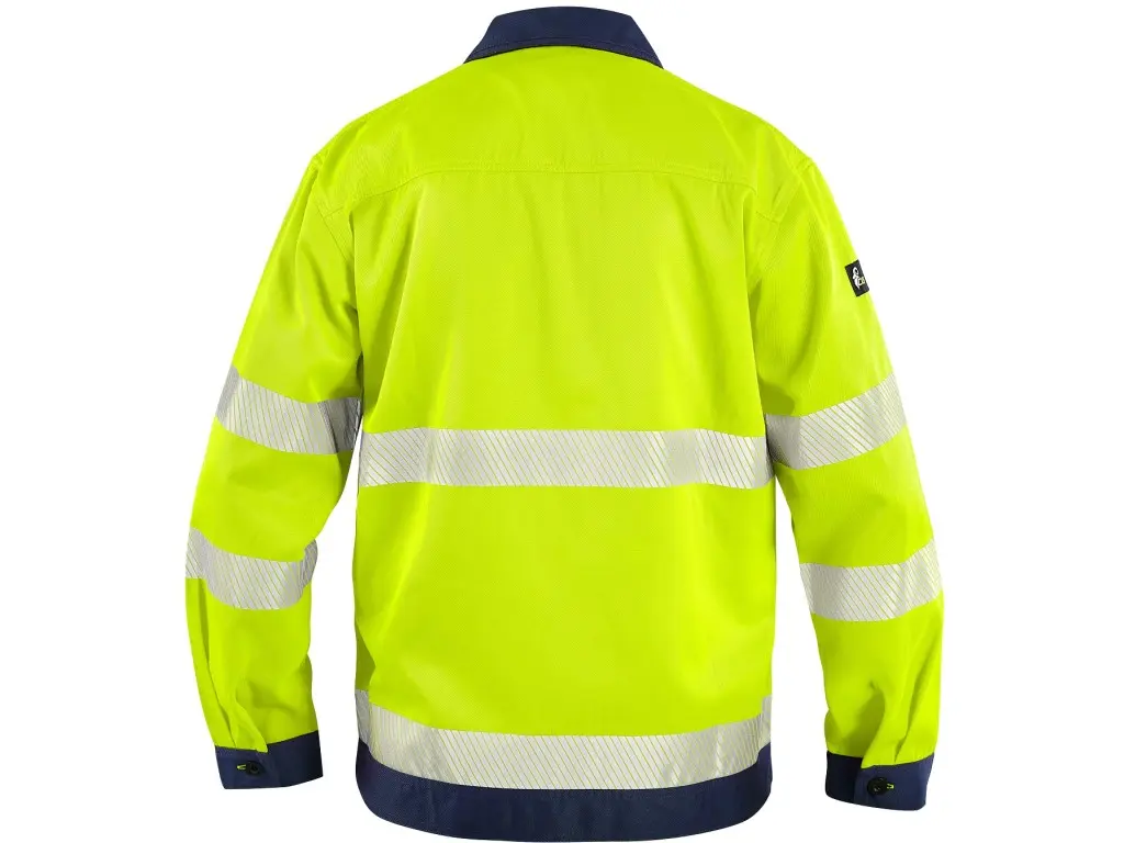 Męska bluza ostrzegawcza z segmentowymi taśmami odblaskowymi (o szerokości 5 cm). Splot diagonal zapewnia trwałość i odporność materiału. Bluza posiada zakryte zapięcie na plastikowe guziki, kieszenie na piersi z patkami na rzep – lewa z ukrytą kieszenią na zamek, prawa z małą kieszonką na długopis. Dodatkowo wyposażona jest w kieszenie boczne oraz mankiety zapinane na plastikowy guzik. Zalecane zastosowanie: budownictwo, prace drogowe, kierowcy, utrzymanie, logistyka, transport lotniczy i morski, odśnieżanie, ratownictwo.