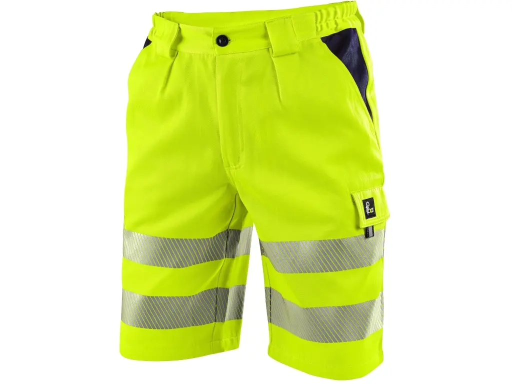 Męskie szorty ostrzegawcze z segmentowymi taśmami odblaskowymi (o szerokości 5 i 6 cm). Wytrzymały splot diagonalny zapewnia trwałość i odporność materiału. Spodenki zapinane są na kryty zamek błyskawiczny i plastikowy guzik. Pas z szlufkami na pasek jest elastyczny po bokach. Spodenki posiadają wiele praktycznych kieszeni: 2 kieszenie z przodu, 2 kieszenie z tyłu z klapką na rzep oraz 2 kieszenie boczne z klapką na rzep. Zalecane zastosowanie: budownictwo, prace drogowe, kierowcy, utrzymanie, logistyka, transport lotniczyi morski, odśnieżanie, ratownictwo.