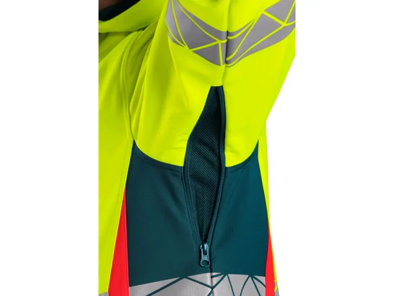 Męska kurtka ostrzegawcza z odpinanym kapturem, odporna na działanie wody i wiatru. Kołnierz polarowy, wentylacja pod pachami, regulowane mankiety na rękawach, wewnętrzne mankiety w rękawach, przykryte zapięcie na zamek i zatrzaski, kieszenie na piersi i kieszenie boczne, prawa kieszeń na piersi z miejscem na ID kartę, segmentowe taśmy odblaskowe, kontrastowe dodatki w kolorze czerwonym HV i niebieskim, wewnętrzne kieszenie na piersi, ściągacz w brzegu dolnym, membrana TPU, wodoodporność materiału 8000 mm poza strefą szwów, paroprzepuszczalność 5000 g/m2/24h.