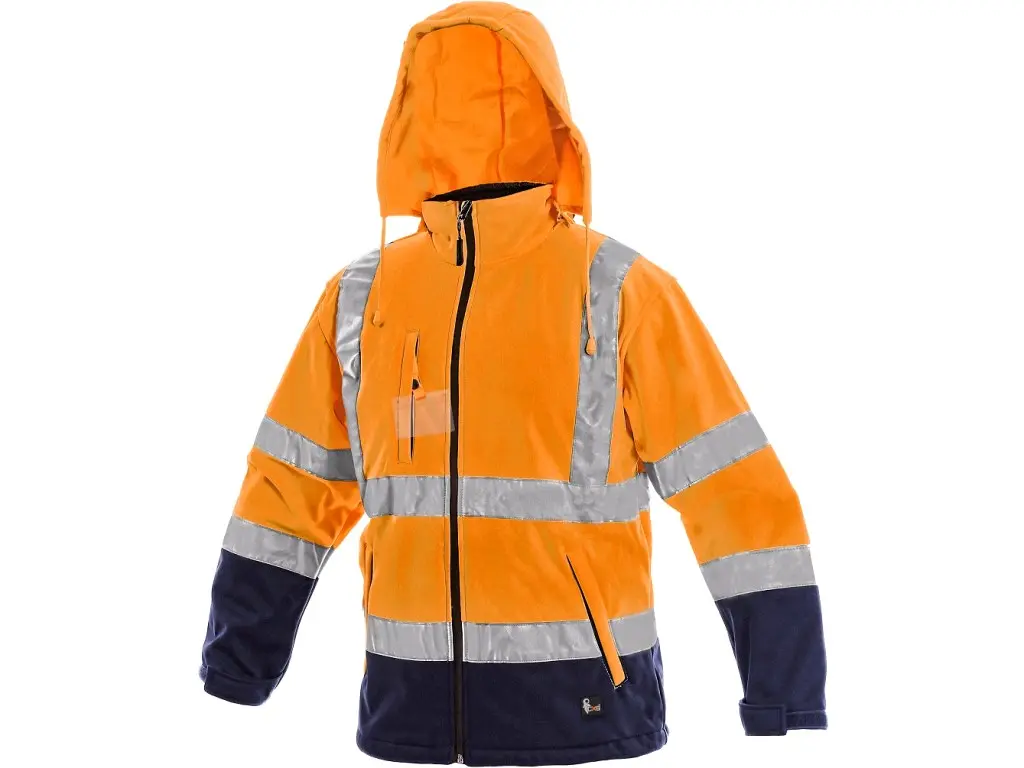 Ostrzegawcza kurtka softshellowa z odblaskowymi paskami, wodo i wiatro odporna, odpinany kaptur, rękawy z regulowanym mankietem, zciaganie na dole kurtki, TPU membrana, 3 zewnętrzne kieszenie na suwak, na prawej stronie możliwość uchwytu karty identyfikacyjnej. Zalecane zastosowanie: budownictvo, pracownicy na drogach, kierowcy, utrzymanie, logistyka, sanitariuszy.