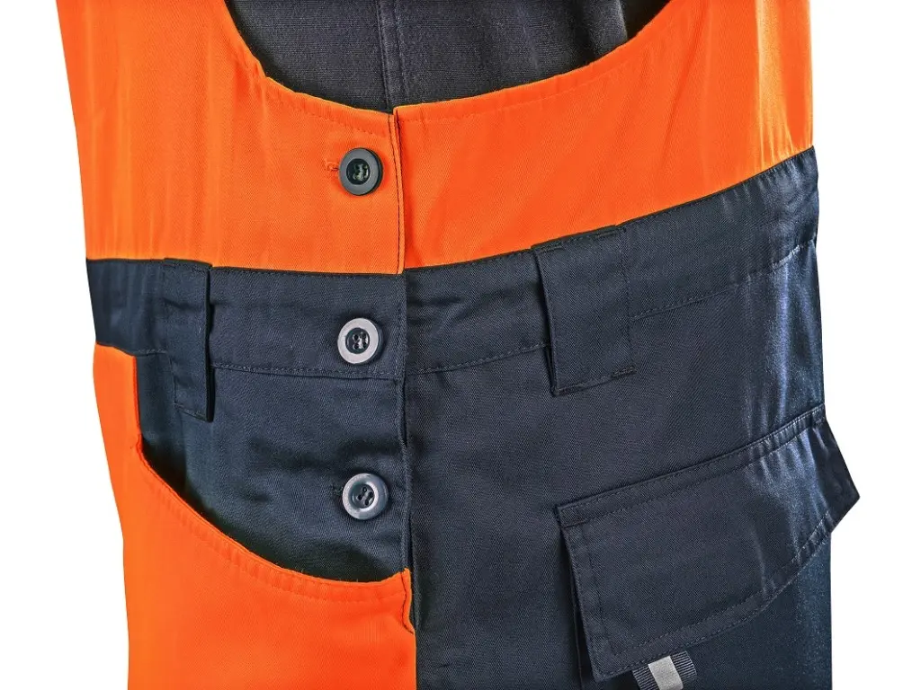 Męskie ogrodniczki ostrzegawcze CXS HALIFAX przeznaczone są do pracy w okresie letnim. Wyposażone są w segmentowe taśmy odblaskowe o szerokości 8 cm, które zapewniają wysoką widoczność, jednocześnie zachowując elastyczność materiału. Regulowane szelki z gumką z tyłu umożliwiają swobodę ruchu i wygodne noszenie. Spodnie mają pas ze szlufkami na pasek i boczne zapięcie na guziki, zakryty zamek błyskawiczny oraz szereg praktycznych kieszeni – kieszeń na piersi z zamkiem, dwie kieszenie przednie, dwie tylne z klapką na rzep oraz prawą kieszeń boczną na zamek. Wzmocnione kolana zwiększają wytrzymałość i umożliwiają włożenie nakolanników, co podnosi komfort pracy w pozycji klęczącej. Po wewnętrznej stronie ud i z tyłu kolan zastosowano materiał siatkowy w celu poprawy mikrocyrkulacji powietrza i odprowadzania ciepła. W połączeniu z bluzą CXS HALIFAX spodnie spełniają normę EN ISO 20471 klasa 3. System EASY-PROLONG umożliwia proste przedłużenie spodni dla wyższej sylwetki. Zalecane zastosowanie: letnia odzież robocza, budownictwo, prace drogowe, logistyka, konserwacja, kierowcy, transport lotniczy i morski, służby ratunkowe, usługi techniczne.