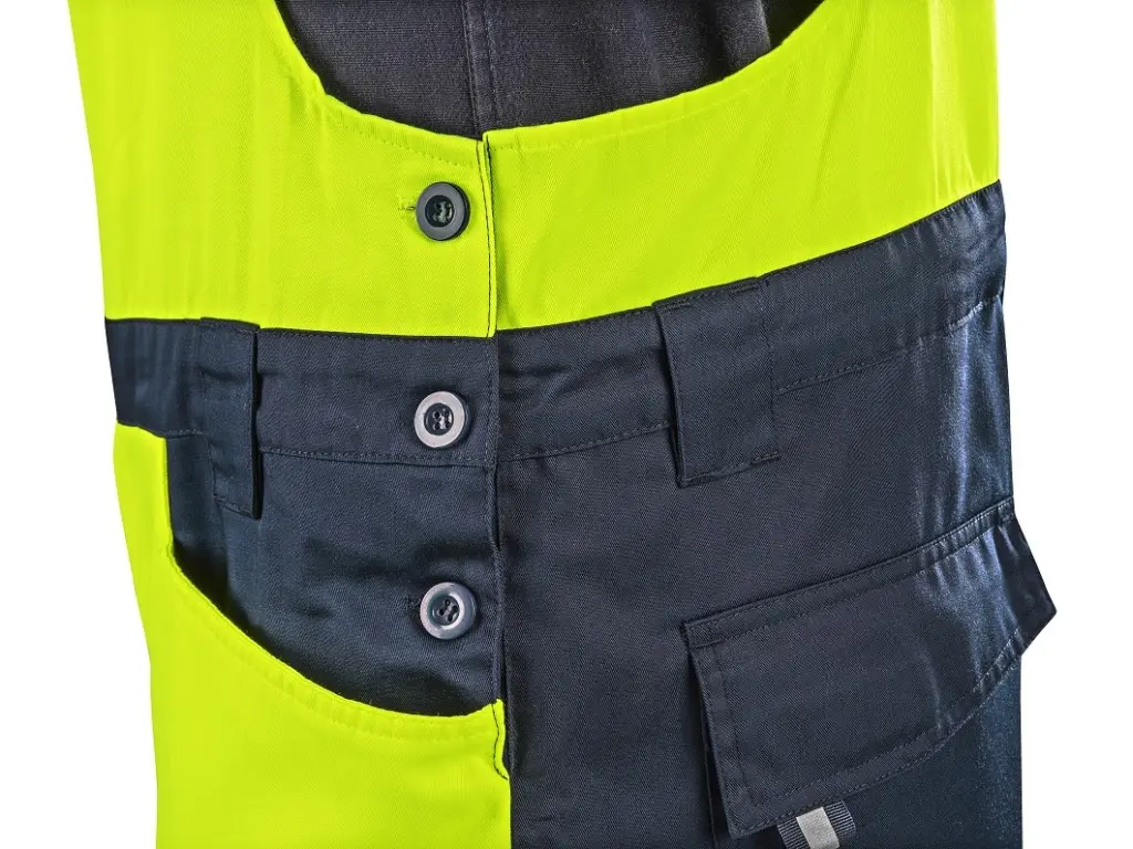 Męskie ogrodniczki ostrzegawcze CXS HALIFAX przeznaczone są do pracy w okresie letnim. Wyposażone są w segmentowe taśmy odblaskowe o szerokości 8 cm, które zapewniają wysoką widoczność, jednocześnie zachowując elastyczność materiału. Regulowane szelki z gumką z tyłu umożliwiają swobodę ruchu i wygodne noszenie. Spodnie mają pas ze szlufkami na pasek i boczne zapięcie na guziki, zakryty zamek błyskawiczny oraz szereg praktycznych kieszeni – kieszeń na piersi z zamkiem, dwie kieszenie przednie, dwie tylne z klapką na rzep oraz prawą kieszeń boczną na zamek. Wzmocnione kolana zwiększają wytrzymałość i umożliwiają włożenie nakolanników, co podnosi komfort pracy w pozycji klęczącej. Po wewnętrznej stronie ud i z tyłu kolan zastosowano materiał siatkowy w celu poprawy mikrocyrkulacji powietrza i odprowadzania ciepła. W połączeniu z bluzą CXS HALIFAX spodnie spełniają normę EN ISO 20471 klasa 3. System EASY-PROLONG umożliwia proste przedłużenie spodni dla wyższej sylwetki. Zalecane zastosowanie: letnia odzież robocza, budownictwo, prace drogowe, logistyka, konserwacja, kierowcy, transport lotniczy i morski, służby ratunkowe, usługi techniczne.