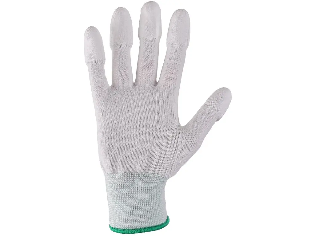 Bezszwowe dziane rękawice z elastycznym mankietem i cienką warstwą poliuretanu na opuszkach palców. Zalecane zastosowanie: przemysł samochodowy, elektronika, logistyka, magazyn, ogród, lekki montaż.