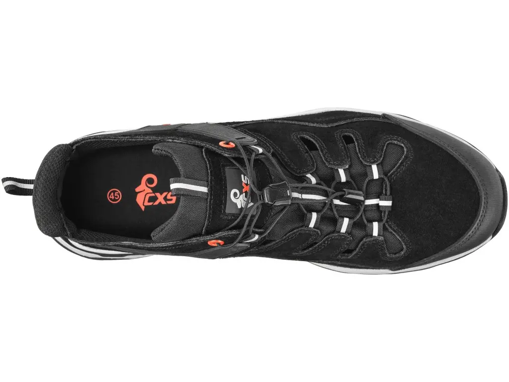 Półbut roboczy, perforowany, ze stalowym noskiem. Materiał: cholewka z 1,4 - 1,6 mm jakościowej skóry szlifowanej w kombinacji z oddychającą tkaniną Cambridge, elementy odblaskowe z PU, oddychająca mesh podszewka odporna na ścieranie, podeszwa: PU-TP