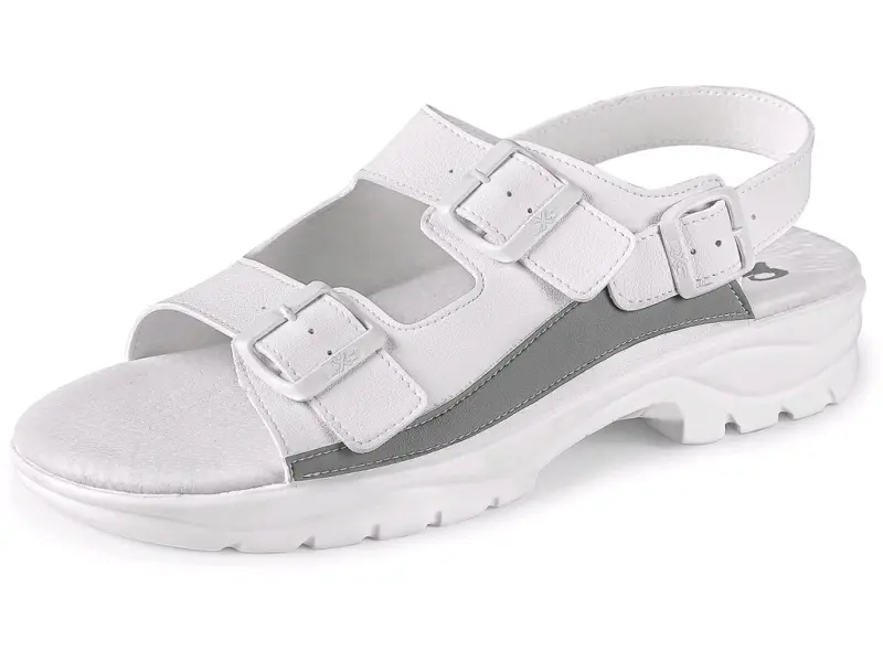 Sandał roboczy z regulowanymi przednimi paskami i paskiem wokół pięty, podeszwa na klinie. Materiał: cholewka z mikrowłókna o grubości 2mm, miękka, wygodna wkładka ze skóry wieprzowej, podeszwa: PU o jednej gęstości, antystatyczna, przeciwpoślizgowa.
