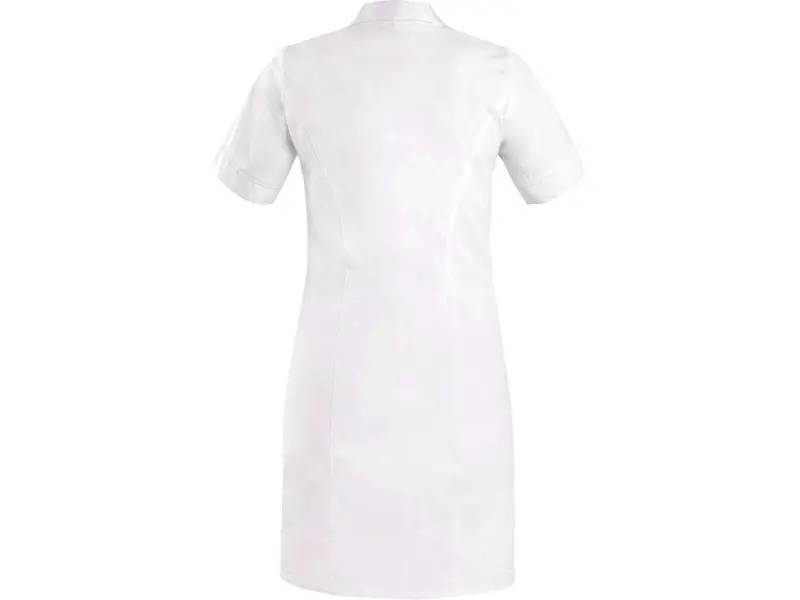 Damska sukienka z krótkim rękawem, fason dopasowany do figury, otwarty kołnierzyk, długość do kolan, przykryte zapięcie na guziki, lewa kieszeń napiersiowa, 2 dolne kieszenie z luźną dolną krawędzią. Zalecane zastosowanie: wellness, salony kosmetyczPokaż więcej...