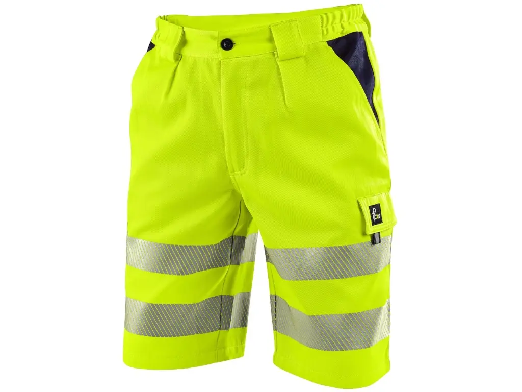 Męskie szorty ostrzegawcze z segmentowymi taśmami odblaskowymi (o szerokości 5 i 6 cm). Wytrzymały splot diagonalny zapewnia trwałość i odporność materiału. Spodenki zapinane są na kryty zamek błyskawiczny i plastikowy guzik. Pas z szlufkami na pasek jest elastyczny po bokach. Spodenki posiadają wiele praktycznych kieszeni: 2 kieszenie z przodu, 2 kieszenie z tyłu z klapką na rzep oraz 2 kieszenie boczne z klapką na rzep. Zalecane zastosowanie: budownictwo, prace drogowe, kierowcy, utrzymanie, logistyka, transport lotniczyi morski, odśnieżanie, ratownictwo.